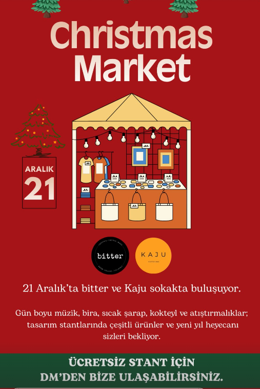 Bodrum, yeni yıl heyecanını sokaklara taşıyor. Şehrin sevilen mekanları bitter ve Kaju, 21 Aralık Pazar günü unutulmaz bir Christmas Market (Noel Pazarı) etkinliği için güçlerini birleştiriyor. Tasarım stantlarından sıcak şaraba kadar pek çok sürprizin yer alacağı etkinlik, tüm Bodrumluları bir araya getirecek.