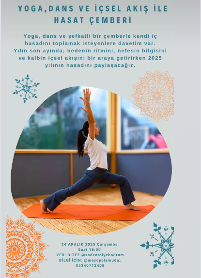 Bodrum Bitez’de düzenlenecek “Hasat Çemberi” etkinliği, 2025 yılının yorgunluğunu atmak ve yeni yıla taze bir başlangıç yapmak isteyenleri bir araya getiriyor. 24 Aralık’ta gerçekleşecek programda yoga ve dansın şifalı gücüyle içsel bir yolculuğa çıkılacak.