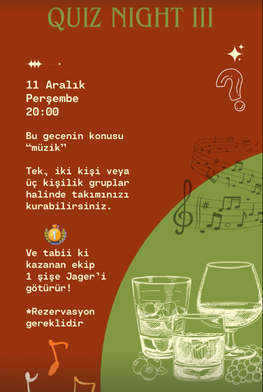 Bu özel Quiz Night III etkinliğinin teması, tüm müzik türlerini kapsayan geniş bir yelpazeye sahip: “müzik”. Popüler kültürden klasiklere, rock tarihinden güncel hitlere kadar müzik bilginize güveniyorsanız, bu gece tam size göre!