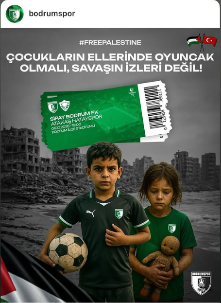 Bodrumspor, görselin üzerine büyük harflerle, “Çocukların Ellerinde Oyuncak Olmalı, Savaşın İzleri Değil!” sloganını yerleştirdi. Bu güçlü mesajın yanı sıra, görselde yer alan maç bileti ve #FreePalestine etiketi, kulübün Filistin’de yaşanan insanlık dramına karşı sessiz kalmayacağını ve maç gelirlerini bu amaç doğrultusunda kullanacağını işaret etti.