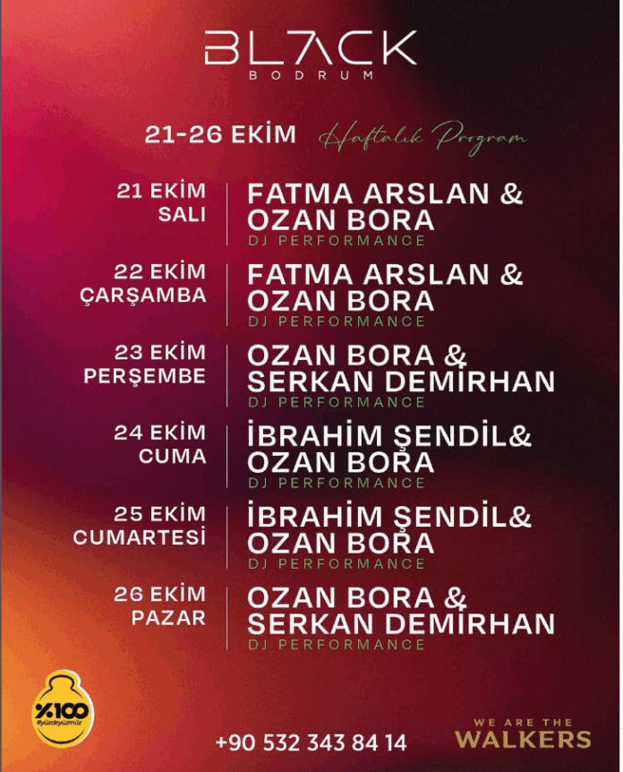 Bodrum eğlence hayatının gözde mekanlarından Black Bodrum, 21-26 Ekim haftalık programıyla yerli ve yabancı misafirlerine kesintisiz bir müzik ziyafeti sunmaya hazırlanıyor. “WE ARE THE WALKERS” mottosuyla dikkat çeken mekan, hafta boyunca en popüler DJ’leri ağırlayarak ritmi yüksek bir atmosfere imza atacak.