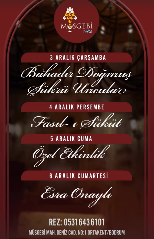 Bodrum’un sevilen mekanı Müsgebi No:1, Aralık ayının ilk haftasına iddialı bir müzik programıyla giriyor. Bodrum’un Ortakent bölgesinde yer alan mekan, Çarşamba’dan Cumartesi’ye kadar uzanan dört günlük programıyla misafirlerine zengin bir müzik ziyafeti sunmaya hazırlanıyor.