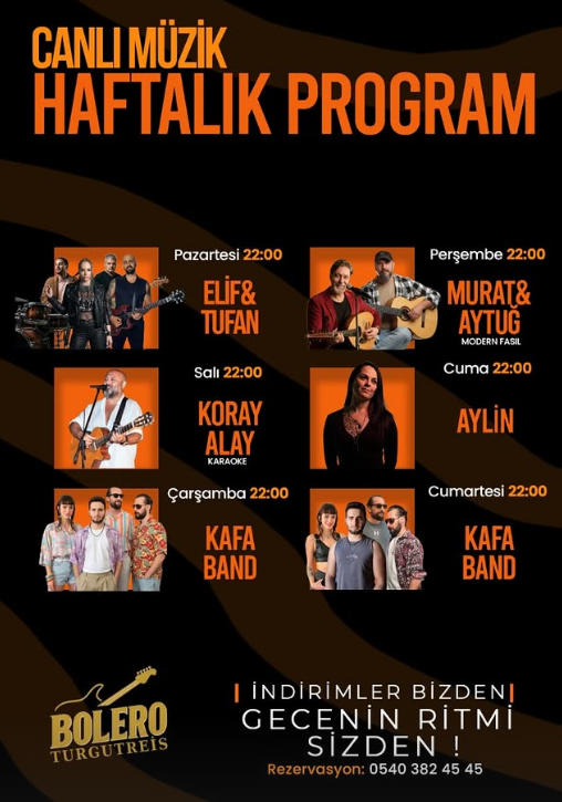 Bodrum’un popüler noktalarından Turgutreis Bolero, yeni haftalık canlı müzik programıyla eğlence severleri bir araya getiriyor. Pazartesi’den Cumartesi’ye uzanan dopdolu takvimde, modern fasıldan karaoke gecelerine kadar geniş bir yelpaze sunuluyor.