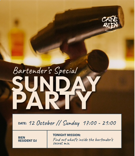 Müziğin ritmini ise Cafe Bien’in Resident DJ’i belirleyecek. DJ performansı eşliğinde katılımcılar, özel olarak hazırlanan bu Pazar Partisi’nin tadını çıkaracak.