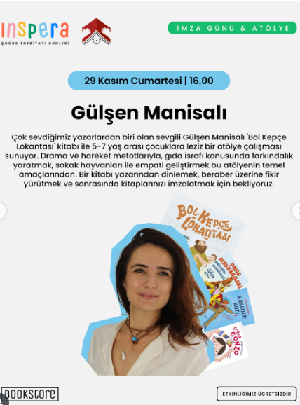 • 📍 Yer: Etkinliği düzenleyen kurum belirtilmelidir (İnspera Çocuk Edebiyatı Günleri’nin gerçekleştiği mekan/kitabevi adı). (Görselde mekan bilgisi net olmadığından burası boş bırakılmıştır.)