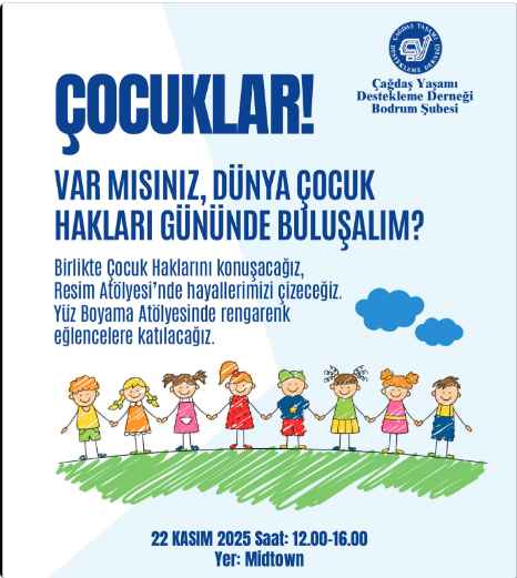 Çağdaş Yaşamı Destekleme Derneği (ÇYDD) Bodrum Şubesi, Dünya Çocuk Hakları Günü olan 20 Kasım haftasını anlamlı bir etkinlikle kutluyor. Çocukların haklarını öğrenirken eğlenmelerini amaçlayan özel bir etkinlik, 22 Kasım 2025 Cuma günü Bodrum Midtown AVM‘de gerçekleşecek. Bu sosyal sorumluluk projesi, bölgedeki ailelerin ve çocukların büyük ilgisini çekmeye hazırlanıyor.