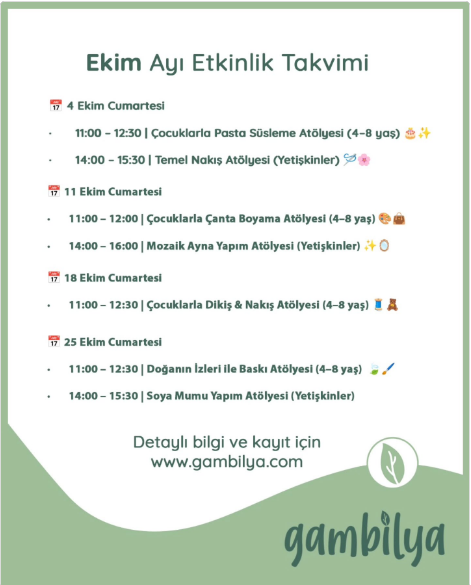 Gambilya Sürdürülebilir Yaşam Merkezi, Ekim ayı boyunca hem çocukların hem de yetişkinlerin yaratıcılıklarını keşfedeceği ve yeni beceriler kazanacağı dolu dolu bir atölye takvimi yayınladı. Bodrum’daki yaşam ve sanat merkezleri arasında dikkat çeken Gambilya, her Cumartesi günü farklı bir temada etkinlik düzenleyecek.