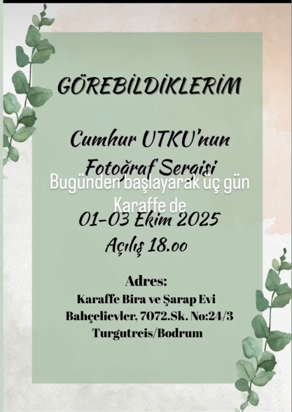 Bodrum, Turgutreis’te sanatseverler için kısa süreli bir fotoğraf sergisi başlıyor. Cumhur Utku’nun “Görebildiklerim” adlı kişisel fotoğraf sergisi, bugün itibarıyla izleyicisiyle buluşuyor.