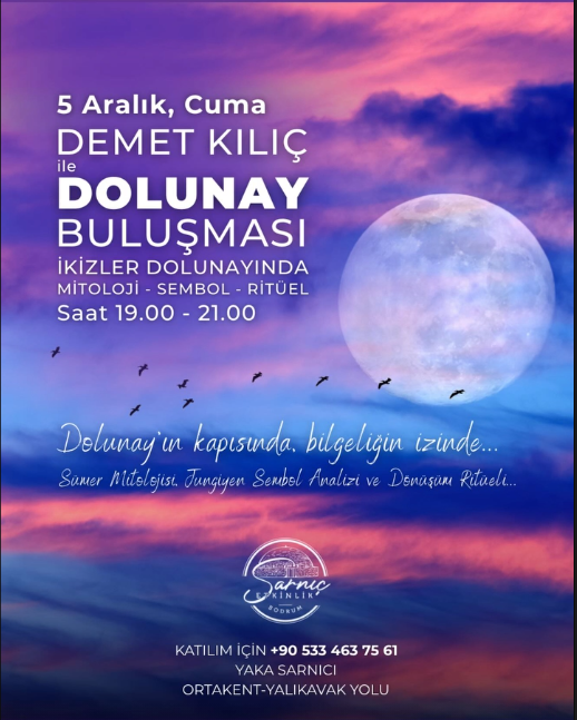 Bodrum, 5 Aralık Cuma akşamı, mistik ve derin bir etkinliğe ev sahipliği yapacak! Demet Kılıç liderliğinde gerçekleşecek olan “Dolunay Buluşması”, İkizler Dolunayı enerjisini mitoloji, sembol ve ritüellerle ele alacak. Bodrumlular ve maneviyata ilgi duyanlar için bilgeliğin izinde unutulmaz bir deneyim sunuluyor.