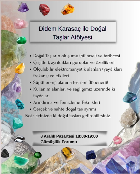 Bodrum’un kültürel yaşamına yeni bir renk katacak olan Doğal Taşlar Atölyesi, 8 Aralık Pazartesi günü 18:00 – 19:00 saatleri arasında Gümüşlük Forumu‘nda gerçekleşecek. Alanında uzman isim Didem Karasaç yönetimindeki bu özel etkinlik, doğal taşların sadece görsel güzelliğini değil, aynı zamanda bilimsel ve enerji alanındaki etkilerini de derinlemesine inceleyecek.
