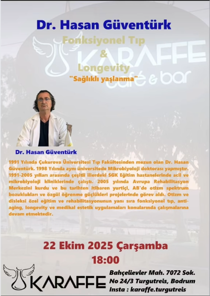 Fonksiyonel Tıp ve Longevity Uzmanı Dr. Hasan Güventürk, 22 Ekim 2025 Çarşamba akşamı Bodrum’da merakla beklenen bir sunum gerçekleştirecek.