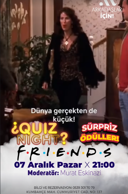 Bodrum’un eğlence hayatına nostaljik ve rekabet dolu bir soluk geliyor! Tüm zamanların en sevilen sitcom’larından biri olan Friends temalı bir bilgi yarışması (Quiz Night), 7 Aralık Pazar akşamı hayranlarıyla buluşacak. Moderatörlüğünü Murat Eskinazi’nin üstleneceği gecede, Friends evrenindeki bilginizi test edip sürpriz ödüller kazanma şansı yakalayacaksınız!