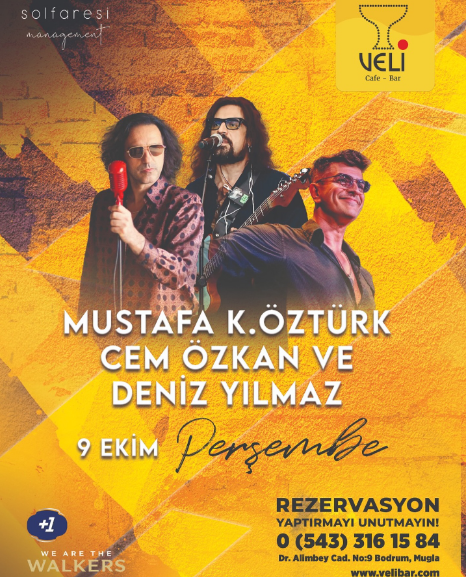 Bodrum’un sevilen mekanı Veli Cafe – Bar, müzikseverlere unutulmaz bir gece yaşatmaya hazırlanıyor. Türk rock ve blues müziğinin önemli isimleri Mustafa K. Öztürk, Cem Özkan ve Deniz Yılmaz, 9 Ekim Perşembe akşamı hayranlarıyla buluşacak.