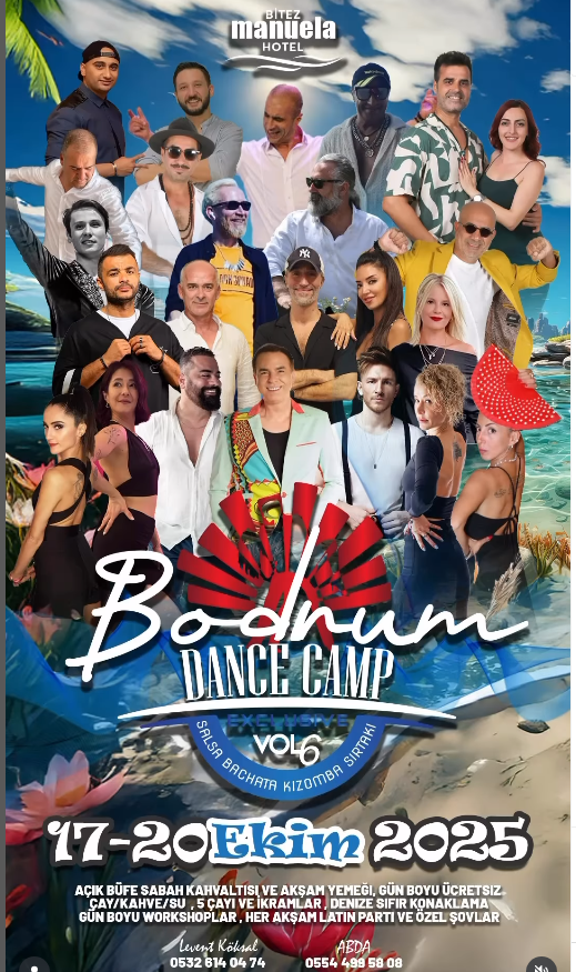 Tarih: 17-20 Ekim 2025 Yer: Bitez Manuela Hotel, Bodrum Kapsam: Salsa, Bachata, Kizomba workshoplar, Latin partiler, Özel şovlar, Açık büfe yeme-içme. İletişim: Levent Köksal – 0532 614 04 74, ABDA – 0554 499 58 08 (Organizasyon ve kayıt bilgileri için).