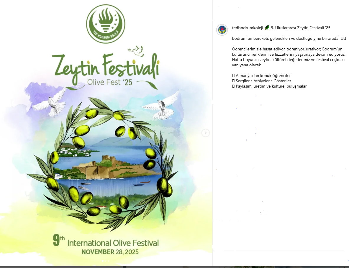 TED Bodrum Koleji yetkilileri, etkinliğin amacını şu sözlerle özetliyor: “Öğrencilerimizle hasat ediyor, öğreniyor, üretiyor; Bodrum’un kültürünü, renklerini ve lezzetlerini yaşatmaya devam ediyoruz. Hafta boyunca zeytin, kültürel değerlerimiz ve festival coşkusu yan yana olacak.”