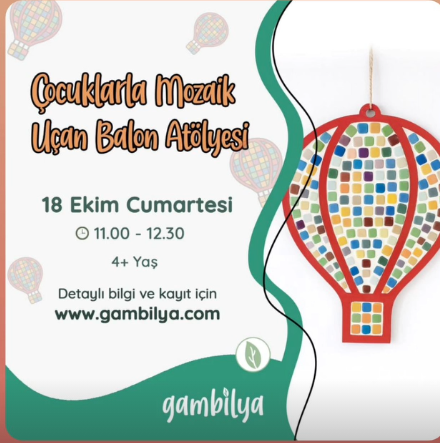 Bodrum’un atölye ve etkinlik mekanı Gambilya, 18 Ekim Cumartesi günü 4 yaş ve üzeri çocuklar için özel bir yaratıcılık etkinliğine ev sahipliği yapacak. Düzenlenen “Çocuklarla Mozaik Uçan Balon Atölyesi” ile minikler, hem el becerilerini geliştirecek hem de mozaik sanatının renkli dünyasıyla tanışacak.