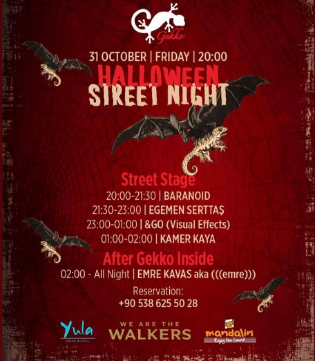Rezervasyonlar için, ilgilenenlerin +90 538 625 50 28 numaralı telefon hattunu aramaları gerekiyor. Gekko, bu Cadılar Bayramı gecesinde konuklarını hem sokakta hem de içeride kesintisiz bir müzik şölenine davet ediyor. Parti müdavimleri, yarasa ve korku temalı dekorasyonların eşlik edeceği bu gece için yerlerini şimdiden ayırtmaya başladı.