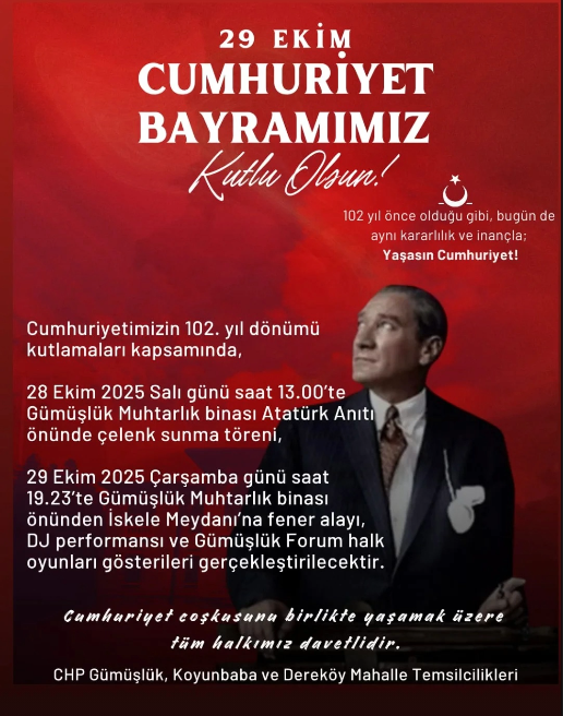 Cumhuriyetimizin 102. yıl dönümü coşkusunu yaşatmak amacıyla CHP Gümüşlük, Koyunbaba ve Dereköy Mahalle Temsilcilikleri, bölge halkını kapsayan özel bir kutlama programı hazırladı. “102 yıl önce olduğu gibi, bugün de aynı kararlılık ve inançla; Yaşasın Cumhuriyet!” mesajıyla duyurulan etkinlikler dizisi, 28 ve 29 Ekim tarihlerine yayılacak.