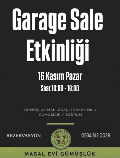 Bodrum’un gözde semti Gümüşlük, sonbaharın en keyifli etkinliğine ev sahipliği yapmaya hazırlanıyor. Masal Evi Gümüşlük, 16 Kasım Pazar günü, ikinci el severlerin ve fırsat avcılarının heyecanla beklediği büyük “Garage Sale Etkinliği” ile kapılarını açıyor.