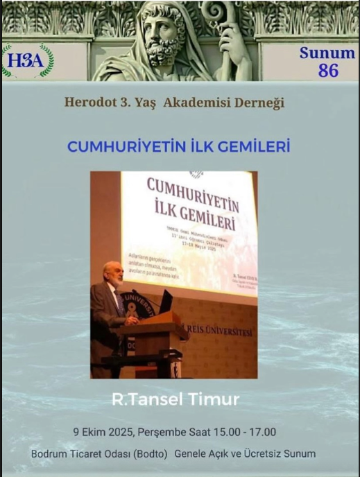 Herodot 3. Yaş Akademisi Derneği, Cumhuriyet tarihinin denizcilik alanındaki önemli bir dönüm noktasını ele alacak. Denizcilik camiasının yakından tanıdığı, deneyimli isim R. Tansel Timur, “Cumhuriyet’in İlk Gemileri” başlıklı bir sunum gerçekleştirecek. Sunum, 9 Ekim 2025 Perşembe günü, saat 15.00-17.00 arasında Bodrum Ticaret Odası’nda (Bodto) yapılacak.