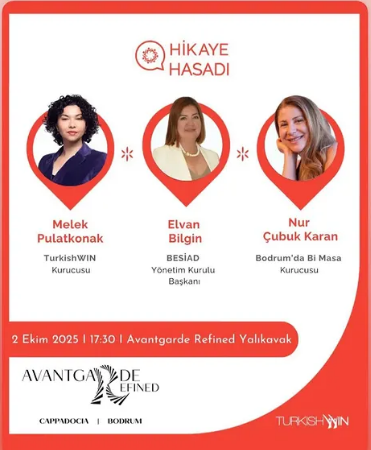 TurkishWIN Kurucusu Melek Pulatkonak, BESİAD Başkanı Elvan Bilgin ve Bodrum’da Bi Masa Kurucusu Nur Çubuk Karan, “Hikaye Hasadı” etkinliğinde bir araya gelerek iş ve sosyal hayat yolculuklarını anlatacak.