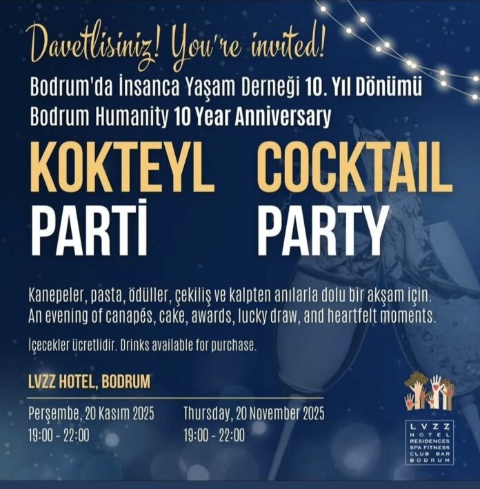 Bodrum’da İnsanca Yaşam Derneği (Bodrum Humanity), 10 yıllık başarılı çalışmalarını anlamlı bir etkinlikle taçlandırıyor. Derneğin kuruluşunun 10. yıl dönümü, özel bir Kokteyl Partisi ile kutlanacak.