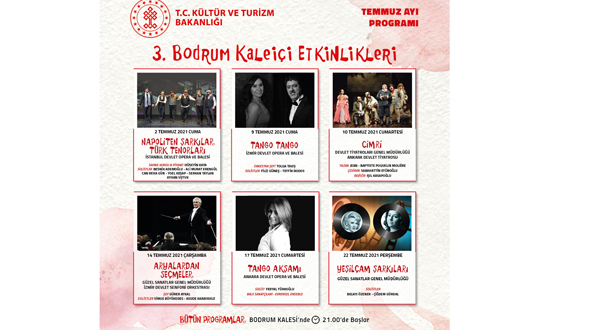 Güzel Sanatlar Genel Müdürlüğü 13 Temmuz 2021 tarihinde “Bodrum Kalesi’nde Dünya Müzikleri”, 22 Temmuz 2021 tarihinde “Yeşilçam Şarkıları” konserleri gerçekleştirilecek.