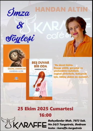 Handan Altın’ın, “Bu davet bizim; Duygu yüklü, gerçekçi ve yönlendirici öykülerle ezgisel şiirlerle, buluşmak için, ödünç alalım mı zamanı?” sözleriyle duyurduğu bu özel buluşma, edebiyatseverler için kaçırılmaması gereken bir fırsat sunuyor. Tüm sanatseverler, yazarla tanışmak ve kitaplarını imzalatmak için Karaffe Cafe’ye davetlidir.