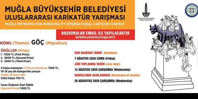 Muğla Büyükşehir Belediyesi’nin düzenlediği ‘Göç’ konulu Uluslararası Karikatür Yarışmasının son başvuru tarihi 7 Ağustos olarak güncellenirken jüri toplanma tarihi ise 12 Ağustos olarak belirlendi.