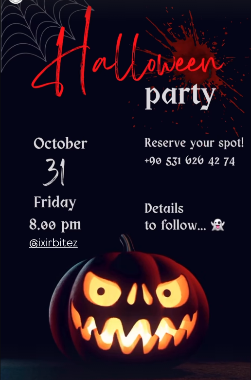 Cadılar Bayramı coşkusu yaklaşıyor! Sosyal medyada paylaşılan bir görsele göre, @ixirbitez kullanıcı adlı işletme, 31 Ekim Cuma akşamı korku dolu bir partiye ev sahipliği yapmaya hazırlanıyor.
