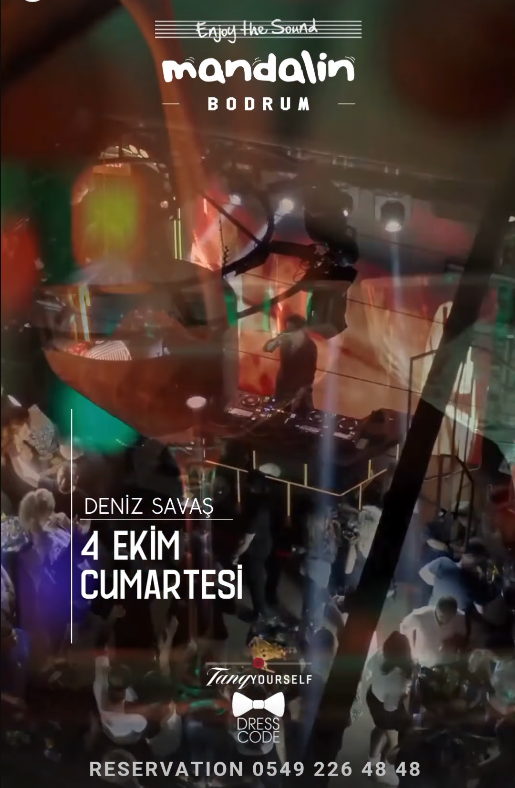 Enjoy the Sound” mottosuyla dikkat çeken Mandalin Bodrum, 4 Ekim Cumartesi gecesi Deniz Savaş‘ın performansı ile coşacak. Savaş’ın setleri, dinamik ritimleri ve akılda kalıcı melodileriyle tanınıyor. Gece boyunca dans pistinin hareketli kalması beklenirken, katılımcılar modern elektronik müziğin en iyi örnekleriyle eğlenceye doyacak.