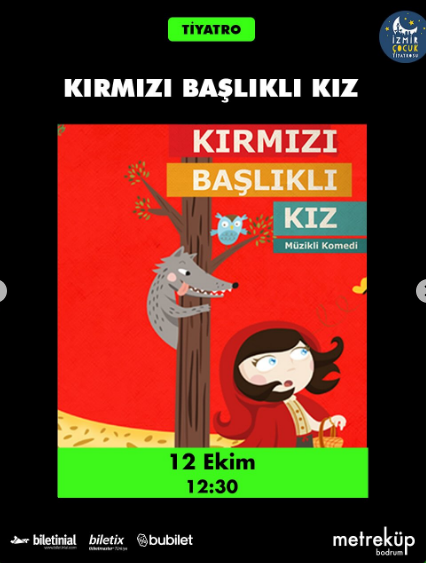 Ailelerin ve çocukların keyifli bir hafta sonu geçirmesi için ideal bir etkinlik olan “Kırmızı Başlıklı Kız” biletleri, Biletinial, Biletix ve Bubilet gibi online platformlardan temin edilebilir.