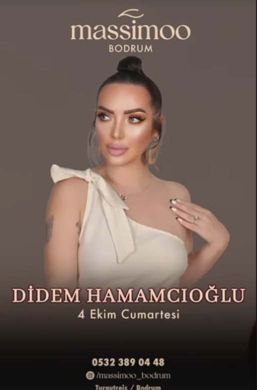 Güzelliği ve sahne enerjisiyle adından sıkça söz ettiren Didem Hamamcıoğlu, Massimoo Bodrum’un dinamik atmosferinde hayranlarıyla buluşacak. Hamamcıoğlu’nun sahne alacağı gecede, popüler müzik ve hareketli parçalardan oluşan repertuvarıyla misafirlere keyifli saatler sunması bekleniyor.