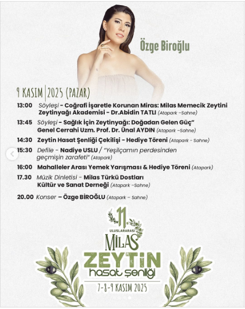 - 20:00’de ise pop müziğin sevilen sesi, güçlü yorumcu ve söz-müzik yazarı Özge Biroğlu (Rafet El Roman’a yaptığı vokalistlik ve çıkardığı single’larla tanınıyor) Milas Atapark-Sahne’de sahne alarak şenliğe coşkulu bir kapanış konseriyle imza atacak.
