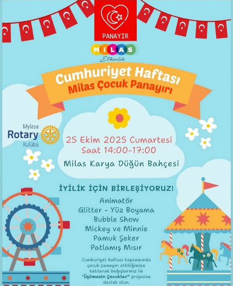 Türkiye Cumhuriyeti’nin kuruluş haftasını kutlamak amacıyla, Mylasa Rotary Kulübü ve Panayır Milas Etkinlik işbirliğiyle çocuklara özel dev bir etkinlik düzenleniyor. “Cumhuriyet Haftası Milas Çocuk Panayırı”, yarın, yani 25 Ekim 2025 Cumartesi günü, Milas Karya Düğün Bahçesi‘nde minik misafirlerini ağırlayacak.