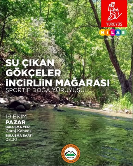 Muğla’nın doğal güzelliklerini keşfetmek isteyen doğa tutkunları için Milas Dağcılık ve Doğa Sporları Kulübü (MİDOSK), 19 Ekim Pazar günü “Su Çıkan – Gökçeler İncirliin Mağarası Sportif Doğa Yürüyüşü” düzenliyor. Bölgenin eşsiz kanyon ve mağara oluşumlarını kapsayan parkur, katılımcılara unutulmaz bir deneyim vaat ediyor.