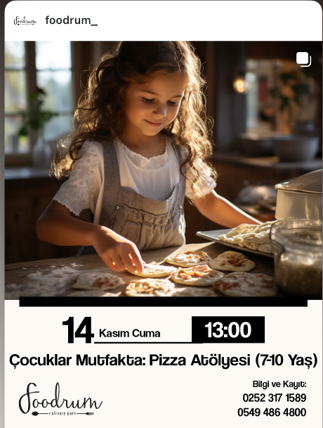 Bodrum’un minik gurmeleri fırın başına! Foodrum Culinary Park, çocukların mutfakla eğlenceli bir şekilde tanışmasını sağlayan popüler serisi “Çocuklar Mutfakta” kapsamında, lezzet dolu bir Pizza Atölyesi düzenliyor. 7-10 yaş grubuna özel hazırlanan bu etkinlik, 14 Kasım Cuma günü saat 13:00’da gerçekleşecek.