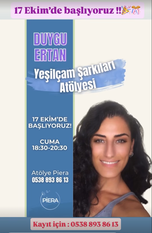 Kayıt ve Bilgi İçin: Atölye Piera’da düzenlenecek olan “Duygu Ertan ile Yeşilçam Şarkıları Atölyesi”ne katılmak isteyenler, 0538 893 86 13 numaralı telefondan detaylı bilgi alabilir ve kayıt işlemlerini gerçekleştirebilirler.