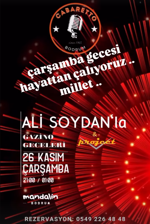 Bodrum’un köklü eğlence mekânlarından Cabaretto Bodrum, çarşamba akşamını unutulmaz bir performansa ayırıyor. Ünlü sanatçı Ali Soydan ve proje ekibi, “Gazino Geceleri” konseptiyle sahne alarak misafirlere hem nostaljik hem de yüksek enerjili bir eğlence vadediyor.