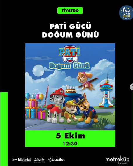 İzmir Çocuk Tiyatrosu’nun sevilen yapımı “Pati Gücü Doğum Günü” tiyatro oyunu, televizyonların popüler animasyon serisinden ilham alarak minik izleyicilerle buluşuyor. 5 Ekim Pazar günü Metreküp Bodrum sahnesinde sahnelenecek oyun, çocuklara arkadaşlığın ve paylaşmanın önemini eğlenceli bir dille anlatıyor.