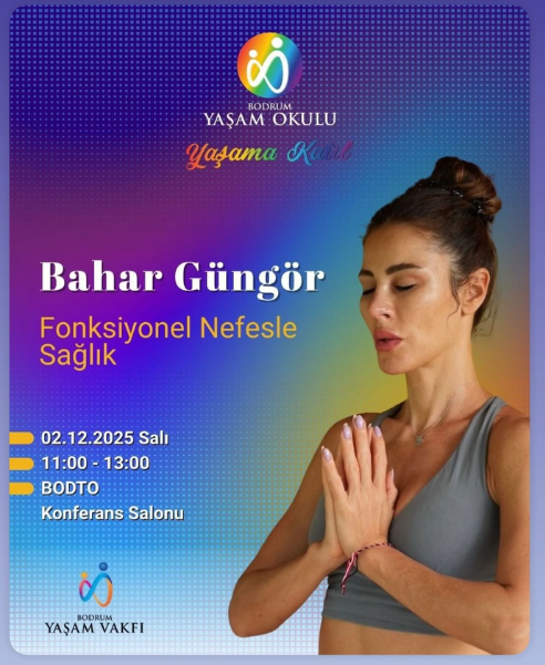 Bodrum Yaşam Okulu ve Bodrum Yaşam Vakfı iş birliğiyle, sağlıklı yaşam ve nefes teknikleri üzerine önemli bir seminer düzenleniyor. Uzman eğitmen Bahar Güngör, “Fonksiyonel Nefesle Sağlık” başlıklı semineriyle Bodrumlularla buluşacak.