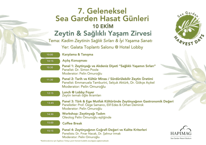 Türkiye’nin zeytincilik alanındaki en önemli etkinliklerinden biri olan 7. Geleneksel Sea Garden Hasat Günleri, bu yıl da Hapimag Sea Garden Resort Bodrum‘un ev sahipliğinde gerçekleşiyor. Etkinlik, 10 Ekim‘de “Zeytin & Sağlıklı Yaşam Zirvesi” temasıyla zeytinin ve zeytinyağının çok yönlü faydalarını masaya yatıracak.