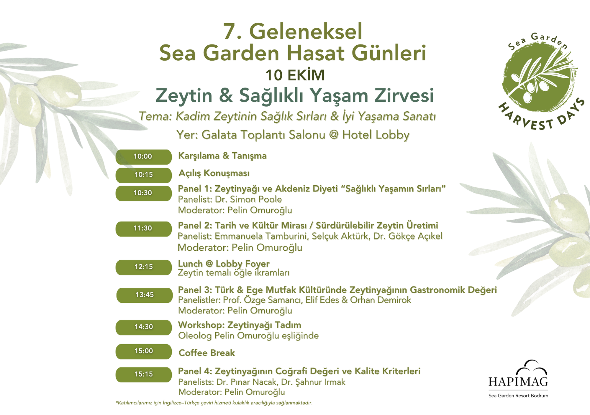 • Türk & Ege Mutfak Kültüründe Zeytinyağı: Prof. Dr. Özge Samancı, Elif Edes ve Hapimag Sea Garden Resort Bodrum Executive Şefi Orhan Demirok’un katılımıyla zeytinyağının gastronomi dünyasındaki yeri ele alınacak.