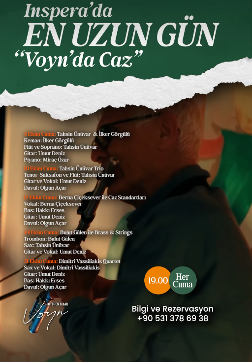 Sanat, tasarım ve lezzeti bir araya getiren Inspera Bodrum, Voyn Kitchen & Bar’da düzenlediği “En Uzun Gün Voyn’da Caz” konser serisiyle müzikseverlere unutulmaz anlar yaşatmaya devam ediyor. Her Cuma akşamı saat 19.00’da başlayan etkinlikler, Ekim ayı boyunca cazın en seçkin isimlerini ağırlıyor.