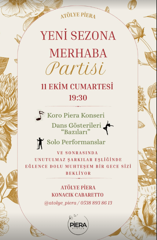 Programın resmi bölümünün ardından ise gece, unutulmaz şarkılar eşliğinde eğlence dolu bir partiye dönüşecek. Etkinlik, Atölye Piera’nın tüm eğitmenleri, öğrencileri ve sanatsever dostlarını bir araya getirerek yeni sezonda sanat üretiminin ve paylaşımın altını çizecek.