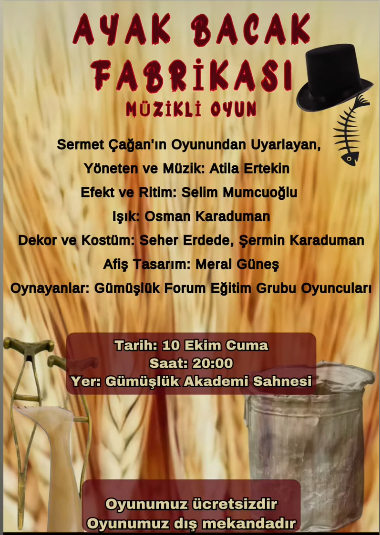 Türk tiyatrosunun toplumcu gerçekçi dönemin önemli eserlerinden Sermet Çağan’ın kaleme aldığı “Ayak Bacak Fabrikası” adlı oyun, Gümüşlük Forum Eğitim Grubu Oyuncuları tarafından müzikli bir yorumla sahneye taşınıyor. Oyun, 10 Ekim 2025 Cuma akşamı tiyatroseverlerle buluşacak.
