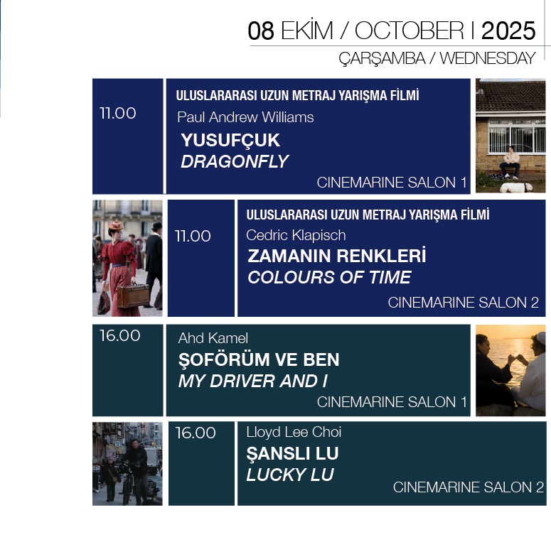 - Cinemarine Salon 1: BAFTA ödüllü Paul Andrew Williams‘ın, yalnızlık ve sosyal ihmal temasını işleyen çarpıcı draması “YUSUFÇUK (DRAGONFLY)”. Film, yaşlı bir komşusuyla beklenmedik bir dostluk kuran Colleen’in hikayesini cesur bir gerçekçilikle anlatıyor.