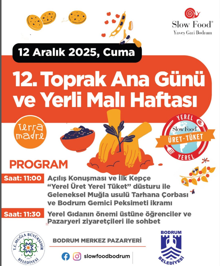 Bodrum, sürdürülebilir gıda ve yerel lezzetlerin önemini vurgulayan anlamlı bir etkinliğe ev sahipliği yapıyor. Slow Food Bodrum (Yavaş Gari Bodrum) organizasyonuyla, 12 Aralık 2025 Cuma günü 12. Toprak Ana Günü ve Yerli Malı Haftası etkinliği düzenlenecek.