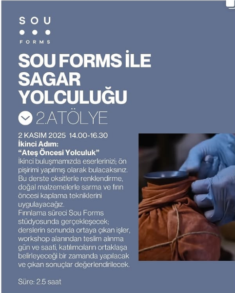 Seramik sanatında doğal malzemeler ve ateşin dönüştürücü gücünü birleştiren Sou Forms atölyeleri, yaratıcı yolculuğuna devam ediyor. “Sou Forms ile Sagar Yolculuğu” serisinin İkinci Adımı: Ateş Öncesi Yolculuk başlıklı atölye, 2 Kasım 2025 Pazar günü sanatseverlerle buluşmaya hazırlanıyor.