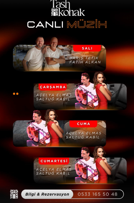 Bodrum’un huzurlu atmosferini lezzet ve müzikle buluşturan Taş Konak, bu haftaki dopdolu canlı müzik programıyla misafirlerini ağırlamaya hazırlanıyor. Sahnede ünlü oyuncu Açelya Elmas ve Saltuğ Kabil’in yanı sıra Barış Tetik ve Fatih Alkan yer alıyor.